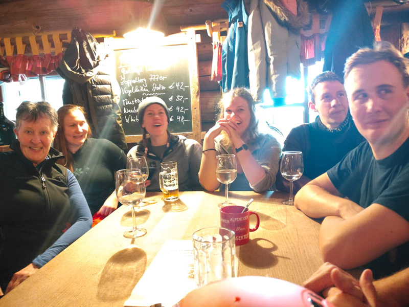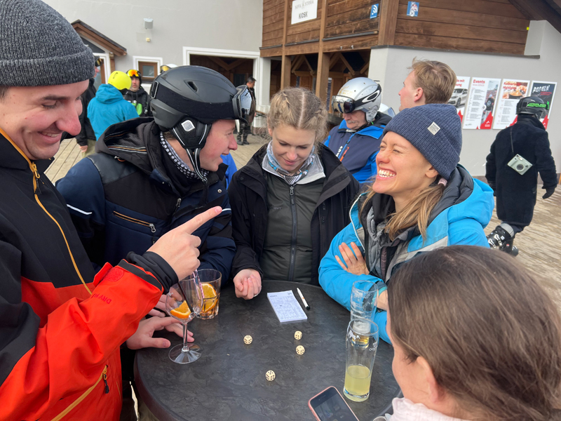 Natürlich durfte auch das Après-Ski nicht fehlen. Nach einem sportlichen Tag auf den Skiern genehmigten wir uns in der Sternenbar einen wohlverdienten Drink, bevor es weiter in die Après-Ski-Hütte ging. Am ersten Abend wurde es fast zu spät, doch wir schafften es gerade noch rechtzeitig auf den letzten Bus, um das Nachtessen im Hotel nicht zu verpassen. Die letzte Abfahrt fand bereits im Dunkeln statt, und unsere Stirnlampen erwiesen sich als äusserst hilfreich.